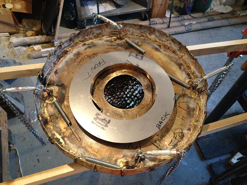 Finishing the brass skep with an oxy-acetylene torch and bronze brazing rods. Surface color was controlled with torch work and a lemon-salt solution; detail was re-introduced with a die grinder. The last image shows a system for hanging the 100 pound sculpture, which will premier at Ronald Feldman Fine Arts in September 2015