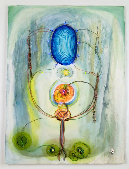The Parallel Series is a collection of “living pictures” that combine visual art with electrical engineering. Electricity flows within these living pictures to generate the animated light and naturalistic sounds of people, animals, apparitions, and deities. Electronic devices and delicate wires are central compositional elements for delicate nervous systems and anatomies of the soul. Because electronic components have an innate lifespan, these artworks have a bittersweet, performative quality like the impermanent sand mandalas of Tibetan Buddhism. The art asks us to be here now and celebrate our dynamic, impermanent nature.